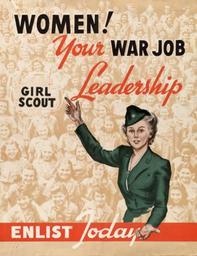| Keywords: Women your war job service.jpg Girl Scout leader beckoning In background photo of hundreds of girl scouts USGov 1941 1945 w United States Office of War Information PD-USGov World War II posters from the United States United States Office of War Information Wartime economy propaganda Women at work in the United States Girl Scouts of the USA |