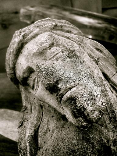 Keywords: wood jesus cross old weathered cracks black white nose mouth eyes sleep death crucified south tyrol church christian crucifix