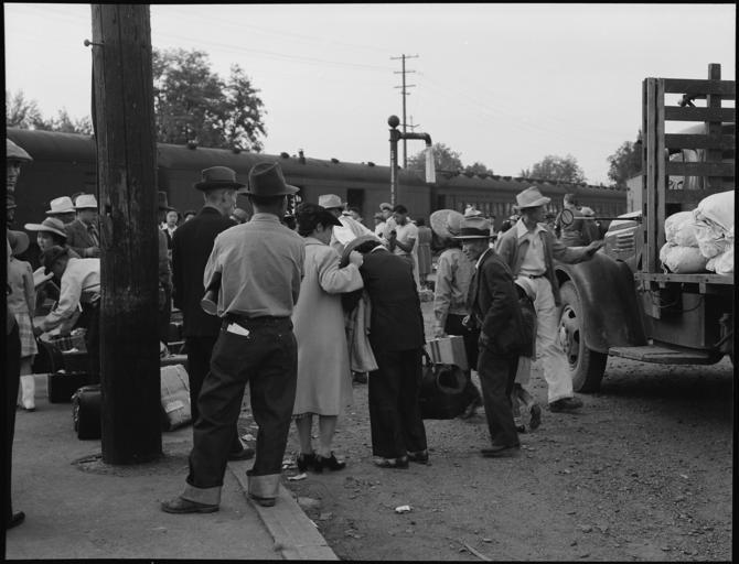 | Keywords: Woodland, California. Women at railroad station on morning of departure of persons of Japanese ance . . . - NARA - 537814.jpg Scope and content The full caption for this photograph reads Woodland California Women at railroad station on morning of departure of persons of Japanese ancestry from this agricultural community to the Merced Assembly center The woman in the dark slack suit is one of the few exhibiting grief on leaving General notes 537814 Local identifier 210-G-C501 Department of the Interior War Relocation Authority 02/16/1944 - 06/30/1946 NARA-Author Lange Dorothea 1895-1965 Photographer 1372774 <br /> Still Picture Records Section Special Media Archives Services Division NWCS-S National Archives at College Park 8601 Adelphi Road College Park MD 20740-6001 1942-04-20 Record group Record Group 210 Records of the War Relocation Authority 1941 - 1989 Record group ARC 537 Central Photographic File of the War Relocation Authority compiled 1942 - 1945 Series ARC 536000 File unit File unit ARC Variant control numbers NAIL Control Number NWDNS-210-G-C501 Other versions <gallery> File Woodland _California _Women_at_railroad_station_on_morning_of_departure_of_persons_of_Japanese_ance_ _ _ _-_NARA_-_537814 tif tif File Woodland _California _Women_at_railroad_station_on_morning_of_departure_of_persons_of_Japanese_ance_ _ _ _-_NARA_-_537814 jpg jpg </gallery> NARA-cooperation PD-USGov Japanese American internment processing in Woodland California Dorothea Lange |