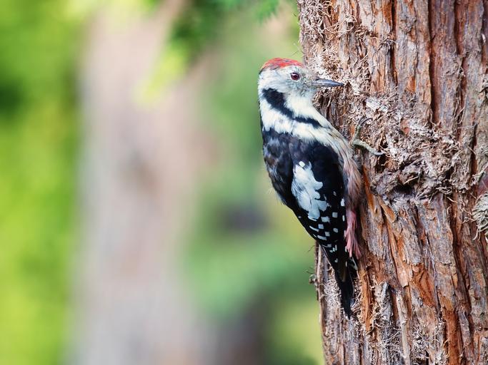 Keywords: woodpecker great spotted woodpecker bird animal nature tree garden log bark copy space