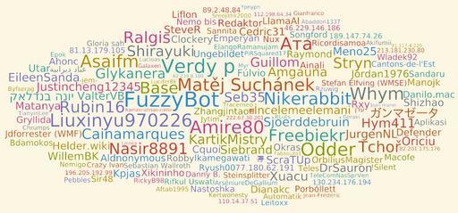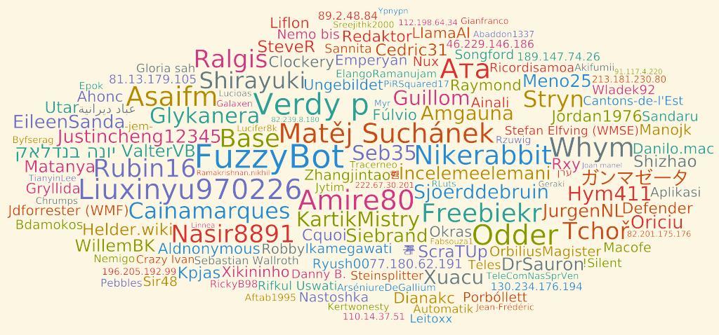 Keywords: Word cloud of Tech News translators.svg tech newsletter as of 2014-07-30 Source data Generated by Tomasz W Kozlowski see below User names are weighted by a function of their number of edits Due to the wide difference in edit counts some names would be huge and others invisible if we used the raw weighting In order to be able to read most names we use edit counts' natural logarithm and add 0 5 so users with only one edit still appear Word cloud generated using http //www wordle net/ Wordle's http //www wordle net/advanced advanced generator by Jonathan Feinberg Due to Wordle's Print function the text was converted to paths and is thus uneditable Color palette http //ethanschoonover com/solarized Solarized by Ethan Schoonover Font  Lucida Sans own Guillaume Paumier 2014-07-30 Source data wikitable sortable User Edit count as of 2014-07-30 ln edit count + 0 5 Color hexadecimal - FuzzyBot 3455 8 65 268bd2 - Verdy p 1511 7 82 2aa198 - Odder 936 7 34 859900 - Liuxinyu970226 910 7 31 6c71c4 - Amire80 829 7 22 d33682 - Ата 745 7 11 dc322f - Matěj Suchánek 724 7 08 cb4b16 - Asaifm 693 7 04 b58900 - Whym 686 7 03 657b83 - Nikerabbit 638 6 96 268bd2 - Freebiekr 474 6 66 2aa198 - Base 417 6 53 859900 - Rubin16 406 6 51 6c71c4 - Ralgis 381 6 44 d33682 - Nasir8891 346 6 35 dc322f - Tchoř 295 6 19 cb4b16 - Stryn 250 6 02 b58900 - Shirayuki 242 5 99 657b83 - Cainamarques 212 5 86 268bd2 - Glykanera 174 5 66 2aa198 - KartikMistry 135 5 41 859900 - Seb35 133 5 39 6c71c4 - Guillom 120 5 29 d33682 - Hym411 117 5 26 dc322f - ガンマゼータ 111 5 21 cb4b16 - Amgauna 100 5 11 b58900 - Xuacu 99 5 10 657b83 - Sjoerddebruin 94 5 04 268bd2 - יונה בנד אק 85 4 94 2aa198 - Siebrand 76 4 83 859900 - EileenSanda 71 4 76 6c71c4 - Justincheng12345 71 4 76 d33682 - Oriciu 68 4 72 dc322f - JurgenNL 66 4 69 cb4b16 - İncelemeelemani 62 4 63 b58900 - DrSauron 61 4 61 657b83 - Meno25 57 4 54 268bd2 - ValterVB 52 4 45 2aa198 - WillemBK 50 4 41 859900 - ScraTUp 48 4 37 6c71c4 - Matanya 46 4 33 d33682 - SteveR 44 4 28 dc322f - Cedric31 43 4 26 cb4b16 - Helder wiki 43 4 26 b58900 - Shizhao 42 4 24 657b83 - Kpjas 40 4 19 268bd2 - Utar 40 4 19 2aa198 - Jordan1976 38 4 14 859900 - Cquoi 37 4 11 6c71c4 - Rxy 36 4 08 d33682 - Redaktor 34 4 03 dc322f - Defender 33 4 00 cb4b16 - Dianakc 33 4 00 b58900 - Clockery 32 3 97 657b83 - Aldnonymous 31 3 93 268bd2 - Fúlvio 31 3 93 2aa198 - Raymond 31 3 93 859900 - Ahonc 29 3 87 6c71c4 - Xikininho 29 3 87 d33682 - Liflon 28 3 83 dc322f - LlamaAl 28 3 83 cb4b16 - Manojk 28 3 83 b58900 - Okras 28 3 83 657b83 - Ungebildet 28 3 83 268bd2 - Danilo mac 27 3 80 2aa198 - Zhangjintao 26 3 76 859900 - Emperyan 25 3 72 6c71c4 - Gryllida 25 3 72 d33682 - Ainali 23 3 64 dc322f - Jdforrester WMF 22 3 59 cb4b16 - OrbiliusMagister 22 3 59 b58900 - Robby 22 3 59 657b83 - Ikamegawati 21 3 54 268bd2 - Sandaru 21 3 54 2aa198 - Macofe 20 3 50 859900 - Nastoshka 20 3 50 6c71c4 - Nemo bis 20 3 50 d33682 - Nux 20 3 50 dc322f - Porbóllett 20 3 50 cb4b16 - Sir48 20 3 50 b58900 - Aplikasi 19 3 44 657b83 - Ryush00 19 3 44 268bd2 - Songford 19 3 44 2aa198 - Bdamokos 18 3 39 859900 - 77 180 62 191 17 3 33 6c71c4 - Wladek92 17 3 33 d33682 - Ricordisamoa 16 3 27 dc322f - Sannita 16 3 27 cb4b16 - Teles 16 3 27 b58900 - عباد ديرانية 16 3 27 657b83 - Cantons-de-l'Est 15 3 21 268bd2 - Rifkul Uswati 15 3 21 2aa198 - Silent 15 3 21 859900 - 81 13 179 105 14 3 14 6c71c4 - Danny B 14 3 14 d33682 - Stefan Elfving WMSE 14 3 14 dc322f - Steinsplitter 14 3 14 cb4b16 - Automatik 13 3 06 b58900 - Gloria sah 13 3 06 657b83 - Leitoxx 13 3 06 268bd2 - 189 147 74 26 12 2 98 2aa198 - Jytim 12 2 98 859900 - 콩 루 11 2 90 6c71c4 - 46 229 146 186 11 2 90 d33682 - 89 2 48 84 11 2 90 dc322f - Crazy Ivan 11 2 90 cb4b16 - -jem- 11 2 90 b58900 - Sebastian Wallroth 11 2 90 657b83 - 130 234 176 194 10 2 80 268bd2 - ElangoRamanujam 10 2 80 2aa198 - Nemigo 10 2 80 859900 - Pebbles 10 2 80 6c71c4 - RickyB98 9 2 70 d33682 - ערן 9 2 70 dc322f - 림 8 2 58 cb4b16 - Aftab1995 8 2 58 b58900 - Akifumii 8 2 58 657b83 - ArséniureDeGallium 8 2 58 268bd2 - Epok 8 2 58 2aa198 - Kertwonesty 8 2 58 859900 - Rzuwig 8 2 58 6c71c4 - 110 14 37 51 7 2 45 d33682 - 196 205 192 99 7 2 45 dc322f - 213 181 230 80 7 2 45 cb4b16 - Byfserag 7 2 45 b58900 - Chrumps 7 2 45 657b83 - PiRSquared17 7 2 45 268bd2 - TeleComNasSprVen 7 2 45 2aa198 - Tracerneo 7 2 45 859900 - Abaddon1337 6 2 29 6c71c4 - Galaxen 6 2 29 d33682 - Gianfranco 6 2 29 dc322f - Jean-Frédéric 6 2 29 cb4b16 - Lucifer8k 6 2 29 b58900 - Lucioas 6 2 29 657b83 - Myr 6 2 29 268bd2 - RLuts 6 2 29 2aa198 - Sreejithk2000 6 2 29 859900 - TianyinLee 6 2 29 6c71c4 - 112 198 64 34 5 2 11 d33682 - 222 67 30 201 5 2 11 dc322f - 82 201 175 176 5 2 11 cb4b16 - Fabsouza1 5 2 11 b58900 - Geraki 5 2 11 657b83 - Ypnypn 5 2 11 268bd2 - 82 239 8 180 4 1 89 2aa198 - 91 117 4 220 4 1 89 859900 - Joan manel 4 1 89 6c71c4 - Linnea 4 1 89 d33682 - Ramakrishnan nikhil 4 1 89 dc322f - Sergento 4 1 89 cb4b16 - Shangkuanlc 4 1 89 b58900 - Tuankiet65 4 1 89 657b83 - קובי כרמ 4 1 89 268bd2 - 111 161 97 254 3 1 60 2aa198 - 151 67 117 52 3 1 60 859900 - 177 148 217 222 3 1 60 6c71c4 - 190 100 56 220 3 1 60 d33682 - 5 54 40 131 3 1 60 dc322f - Amgr 88 3 1 60 cb4b16 - Cekli829 3 1 60 b58900 - Chelin 3 1 60 657b83 - Dobosattilasandor 3 1 60 268bd2 - Lvova 3 1 60 2aa198 - V narsikar 3 1 60 859900 - Vogone 3 1 60 6c71c4 - Xcodexif 3 1 60 d33682 - Zetud 3 1 60 dc322f - Zwiadowca21 3 1 60 cb4b16 - 201 29 180 215 2 1 19 b58900 - 91 196 53 134 2 1 19 657b83 - Abelpadilla 2 1 19 268bd2 - Bjankuloski06 2 1 19 2aa198 - Cwek 2 1 19 859900 - Dzięcioł 3 2 1 19 6c71c4 - Epescopo 2 1 19 d33682 - Liangent 2 1 19 dc322f - Nuriaballtor 2 1 19 cb4b16 - Putnik 2 1 19 b58900 - Takot 2 1 19 657b83 - UsmanPathanKhan 2 1 19 268bd2 - Uziel302 2 1 19 2aa198 - Zerabat 2 1 19 859900 - Zhaofeng Li 2 1 19 6c71c4 - 114 130 28 26 1 0 50 d33682 - 114 187 115 58 1 0 50 dc322f - 176 11 53 141 1 0 50 cb4b16 - 178 2 17 122 1 0 50 b589