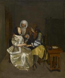 | Keywords: Workshop of Gerard Terborch II - A Glass Of Lemonade - Walters 37341 (2).jpg  By the mid-1600s the intimate lives of the middle class joined the raucous lives of the poor as subjects for painting Here an attentive young man tenderly mixes a restorative glass of lemonade for the young woman presumably to convey his own feelings to the love-sick young woman under the watchful eyes of a chaperon Ter Borch was a talented portraitist as well as painter of interiors with figures in satins and other rich fabrics although the effect is diminished here by an over cleaning of the surface decades ago The models for the young people were the artist's half sister and brother Gersina and Moses who were also painters A first version of this composition was painted around 1663 With the assistance of his workshop Ter Borch then made additional versions with small variations between 1666 1668 Baroque Oil on canvas cm 73 7 61 6 accession number 37 341 26676 Charles T Yerkes date and mode of acquisition unknown Charles T Yerkes Sale American Art Association New York 1910 no 134 Henry Walters city Baltimore Walters Art Museum Henry Walters Acquired by Henry Walters 1910 place of origin Netherlands <gallery> File Workshop of Gerard Terborch II - A Glass Of Lemonade - Walters 37341 jpg </gallery> Walters Art Museum license 2D Paintings in the Walters Art Museum Baroque paintings in the Walters Art Museum Media contributed by the Walters Art Museum needs category review The Glass of Lemonade by Gerard ter Borch II |