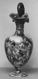 Keywords: Workshop of Guido Durantino - Ewer with Perseus Holding the Head of Medusa - Walters 481511 - Side B.jpg This fine ewer or pitcher would have been placed on a matching basin for washing one's hands or face bearing the same unidentified coat of arms Given how easily earthenware is broken it is not surprising that the basin is lost; few complete sets survive The Greek hero Perseus stands before a serene landscape holding the severed head of the feared Gorgon Medusa a female monster with snakes for hair Perseus accepted the challenge of slaying her in order to save his mother from a forced marriage ca 1550 1560 Renaissance earthenware with tin glaze maiolica cm 34 3 14 2 accession number 48 1511 33939 G H Morland before 1862 by purchase Octavius E Coope Brentwood Essex 1866 by purchase Sale Christie's London May 3 1910 no 28 Jacques Seligmann Paris by purchase Henry Walters city Baltimore Walters Art Museum Henry Walters Acquired by Henry Walters 1910 initials place of origin Urbino Italy Walters Art Museum license Italian Renaissance maiolica in the Walters Art Museum Guido Durantino Media contributed by the Walters Art Museum needs category review |