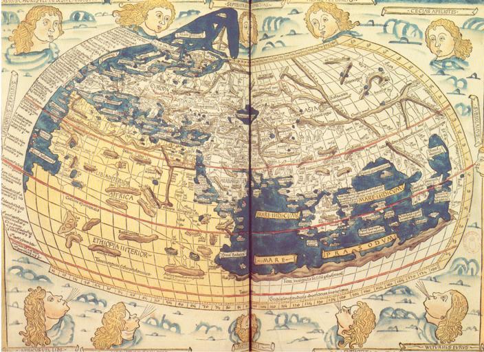 Keywords: World of Ptolemy as shown by Johannes de Armsshein - Ulm 1482.png from the scanned document <br/> On ne possède aucune carte de Ptolémée Celle que nous reproduisons a été gravée sur bois à Ulm en 1482 par Johannes de Armsshein dont le nom est porté dans la marge supérieure <br/> Conçue comme une sphère la Terre comporte les trois continents de l'Antiquité Europe Asie et Afrique environ le tiers du monde aujourd'hui connu Les vents représentés par des têtes aux cheveux blonds soufflent sur la Terre Extrait du périscope La cartographie éditions PEMF - CANNES Holycharly 12 14 8 July 2006 UTC Johannes de Armsshein Ulm 1482 Ce document vous est offet par les Publications de l'Ecole moderne française BP109-06322 CANNES-LA BOCCA CEDEX sentence refering to the source document itself PD-old compare with Kangnido map of the world 1402 Map of the world by Fra Mauro 1459 Cosmographia of the Ptolemaic world Cosmographia Nicolai Germani impressa Ulmae anno 1482 Donnus Nicolaus Germanus 1482 Lienhart Holl La Bocca |