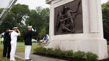 Keywords: Wounded Commodore Joshua Barney, commander of the Chesapeake Flotilla, memorialized.JPG en The Undaunted in Battle memorial to the Battle of Bladensburg designed and sculpted by Joanna Blake was dedicated at Bladensburg Maryland Aug 23 2014 The monument features a bronze sculpture of the end of the battle It depicts a wounded Commodore Joshua Barney commander of the Chesapeake Flotilla Charles Ball a freed slave and flotilla man and an unnamed Marine in honor of the Marines who fought to the bitter end trying to repel British forces 2014-08-23 12 23 56 VIRIN 140823-M-JU941-013 Marine Corps https //www dvidshub net/image/1524825/war-1812-undaunted-legacy-memorialized Vk_l1FJDiHs Photo by Sgt Justin M Boling USAF PD-USGov other versions PD-USGov-Military-Marines Joshua Barney Ceremonies of the United States Marine Corps Uploaded with UploadWizard Battle of Bladensburg |