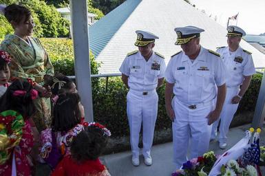 Keywords: Wreath laying ceremony 140516-N-ZS026-292.jpg en Rear Adm Terry Kraft left commander U S Naval Forces Japan Rear Adm Mark Montgomery middle commander Battle Force 7th Fleet and Capt Dave Glennister commander Fleet Activities Yokosuka Japan talk to Japanese girls after a wreath laying ceremony in the Gyokusenji cemetery at the final resting place of five U S Sailors and Marines that died in the service of Commodore Matthew C Perry after his ship first arrived in Shimoda in 1854 Sailors from various commands including the two Arleigh-burke class guided missile destroyers USS John S McCain DDG 56 and USS Mustin DDG 89 visited Shimoda to join the city in celebrating the 75th annual Black Ship Festival U S Navy photo by Mass Communication Specialist 1st Class Trevor Welsh/Released 2014-05-16 Petty Officer 1st Class Trevor Welsh https //www dvidshub net/image/1348915 140516-N-ZS026-292 2014-05-17 02 13 YOKOSUKA JP PD-USGov-Military-Navy Terry Kraft Fleet Activities Yokosuka USS John S McCain DDG-56 USS Mustin DDG-89 Images from DoD uploaded by Fæ Mark C Montgomery David T Glenister |