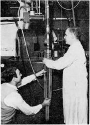 | Keywords: Wu experiment at Bureau of Standards.jpg Wu experiment an elementary particle experiment performed by American physicist Chien-Shiung Wu at the US National Bureau of Standards now NIST in 1956 that established the nonconservation of parity in elementary particle reactions involving the weak force Tsung-Dao Lee and Chen-Ning Yang the theoretical physicists who originated the idea of parity nonconservation and proposed the experiment were awarded the 1957 Nobel Prize in physics for this result In the experiment the intensity of gamma rays emitted by the radioactive isotope en cobalt 60 cooled to near absolute zero and placed in a magnetic field was measured The picture shows the column containing the cobalt-60 detectors and magnetizing coil being slid into a glass Dewar flask before being inserted in the large magnet in background which will cool the sample to cryogenic temperatures <br /><br /> Caption Low temperature experiments at the Bureau demonstrated that the quantum mechanical law of conservation of parity does not hold in the beta decay of cobalt-60 nuclei Apparatus used in the parity studies An outer dewar flask is being place on a glass vacuum chamber containing a sample of radioactive cobalt-60 The large magnet in the background cools the sample almost to absolute zero by adiabatic demagnetization The magnetic field of a solenoid is then used to polarize the cobalt nuclei 1957 Retrieved January 29 2014 from http //books google com/books id 2d1th30kedoC pg RA2-PA22 Annual Report of the National Bureau of Standards for 1957 miscellaneous publication 227 US Government Printing Office Washington D C p 22 reprinted in Research Highlights of the National Bureau of Standards on Google Books A V Astin Director Bureau of Standards CleanFFT PD-USGov Uploaded with UploadWizard Spin intrinsic angular momentum Physics experiments |