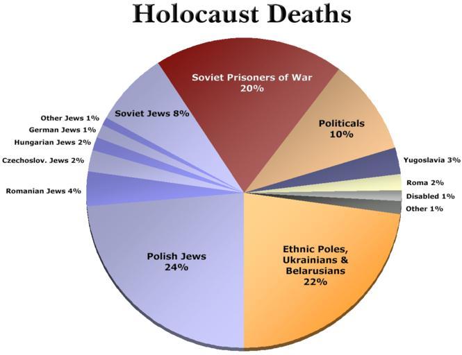 | Keywords: WWII-HolocaustDeaths-Pie-All.png Piechart showing distribution of Holocaust deaths during World War II 1939-1945 Please note that <br> 1 Definitions of the Holocaust vary; some include only Jewish victims and this piechart includes other victims of Nazi persecution <br> 2 <u>All</u> figures of the Holocaust are estimates <br> 3 The pieces colored in light blue nuances are Jewish victims <br> 4 Soviet prisoners are Soviet prisoners of war captured by Germans who died due to various forms of mistreatment <br> 5 Politicals includes communists socialists and other political activists <br> 6 Yugoslavia includes ethnic Serbs Croats Jews Roma and others in former Yugoslavia killed by Germans German collaborators Croatian UstaĊĦe <br> 7 Disabled includes disabled and mentally ill <br> 8 Ethnic Poles Ukrainians Belarusians includes these ethnic groups in Poland Ukraine and Belarus <br> 9 Other includes Freemasons Spanish Republican political prisoners homosexual men and Jehovah's Witnesses <br> The figures used to create the piechart were taken from World War II casualties and The Holocaust Own 2007-10-11 User Dna-Dennis Public domain WWII-HolocaustDeaths-Pie-All svg The Holocaust Pie charts Casualty statistics of World War II |