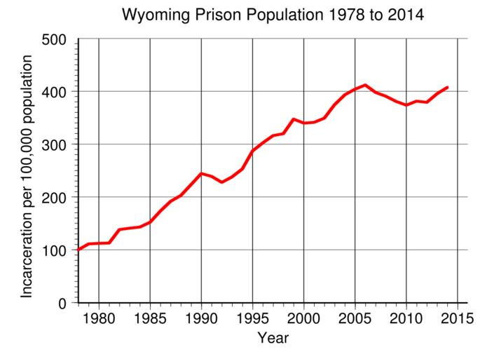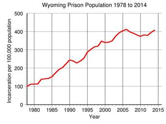 Keywords: Wyoming Prison Population.svg en Wyoming prison incarceration rate per 100 000 population from 1978 to 2014 Data from http //www bjs gov/index cfm ty nps BJS 2016-05-11 own Delphi234 other versions current annually Generated with Wikimedia SVG Chart SVG Chart/box cc-zero Prisons in Wyoming Imprisonment and detention rates in the United States |