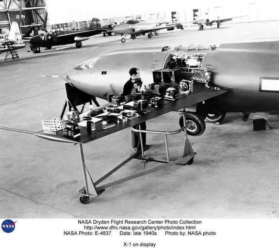 | Keywords: naca nasa nasa dryden flight research center nasadrydenflightresearchcenter airplanes aeronautics 1948 bell x-1 bellx1 x-1 x1 x-plane xplane experimental flight experimentalflight vehicle monochrome airplane aircraft Description (1948) A Bell Aircraft Corporation X-1 series aircraft on display at an Open House at NACA Muroc Flight Test Unit or High-Speed Flight Research Station hangar on South Base of Edwards Air Force Base, California. The instrumentation that was carried aboard the aircraft to gather data is on display. In the background of the photo are several early U.S. jets. These include several Lockheed P-80 Shooting Stars, which were used as chase planes on X-1 flights; two Bell P-59 Airacomets, the first U.S. jet pursuit aircraft (fighter in later parlance); and a prototype Republic XP-84 Thunderjet. Image #: E-4837 Date: October 14, 1948 Description (1948) A Bell Aircraft Corporation X-1 series aircraft on display at an Open House at NACA Muroc Flight Test Unit or High-Speed Flight Research Station hangar on South Base of Edwards Air Force Base, California. The instrumentation that was carried aboard the aircraft to gather data is on display. In the background of the photo are several early U.S. jets. These include several Lockheed P-80 Shooting Stars, which were used as chase planes on X-1 flights; two Bell P-59 Airacomets, the first U.S. jet pursuit aircraft (fighter in later parlance); and a prototype Republic XP-84 Thunderjet. Image #: E-4837 Date: October 14, 1948 |