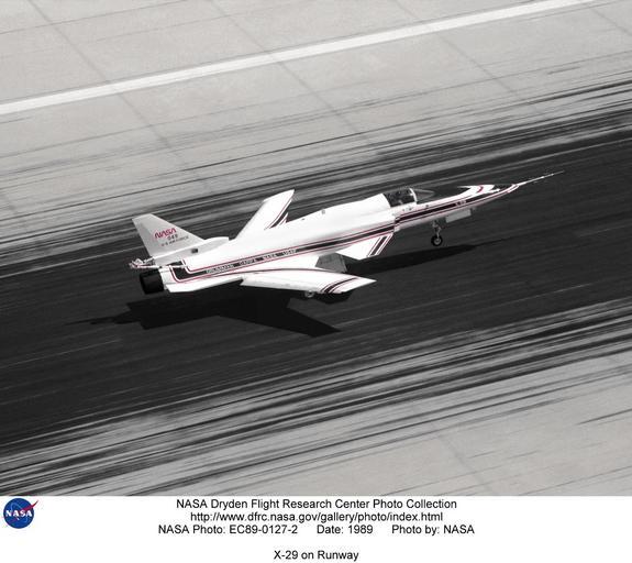 MAKE A MEME View Large Image X-29 on Runway DVIDS743017.jpg en This photo shows the No 2 X-29 technology demonstrator aircraft as it lifts off from the runway at Edwards Air Force base on a 1989 test flight The X-29 was flown by NASA's Ames-Dryden Flight Research ...