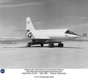 | Keywords: X-2 on Transportation Dolly DVIDS734540.jpg en This 1952 photograph shows the X-2 2 aircraft mounted on a special transportation dolly at Edwards Air Force Base California The dolly was steerable and was used for transporting the X-2 around and for towing it off the lakebed at Edwards Air Force Base after a landing This was the number 2 airplane 46-675 which was lost on May 12 1953 on a captive flight over Lake Ontario when the airplane exploded during a liquid-oxygen topoff test killing the pilot Jean Ziegler and EB-50A crewman Frank Wolko Almost no debris was recovered from Lake Ontario so no cause for the explosion could be determined Later however investigations of similar explosions in the X-1 3 X-1A and X-1D traced the problem to Ulmer leather gaskets which exuded tricresyl phosphate This substance caused detonations in the supercold atmosphere of the airplanes' liquid oxygen tanks As the X-2 2 also had these gaskets they were probably the cause of the explosion in that aircraft as well The X-2 was a swept-wing rocket-powered aircraft designed to fly faster than Mach 3 three times the speed of sound It was built for the U S Air Force by the Bell Aircraft Company Buffalo New York The X-2 was flown to investigate the problems of aerodynamic heating as well as stability and control effectiveness at high altitudes and high speeds in excess of Mach 3 Bell aircraft built two X-2 aircraft These were constructed of K-monel a copper and nickel alloy for the fuselage and stainless steel for the swept wings and control surfaces The aircraft had ejectable nose capsules instead of ejection seats because the development of ejection seats had not reached maturity at the time the X-2 was conceived The X-2 ejection canopy was successfully tested using a German V-2 rocket The X-2 used a skid-type landing gear to make room for more fuel The airplane was air launched from a modified Boeing B-50 Superfortress Bomber X-2 Number 1 made its first unpowered glide flight on Aug 5 1954 and made a total of 17 4 glide and 13 powered flights before it was lost Sept 27 1956 The pilot on Flight 17 Capt Milburn Apt had flown the aircraft to a record speed of Mach 3 2 2 094 mph thus becoming the first person to exceed Mach 3 During that last flight inertial coupling occurred and the pilot was killed The aircraft suffered little damage in the crash resulting in proposals never implemented from the Langley Memorial Aeronautical Laboratory Hampton Virginia to rebuild it for use in a hypersonic Mach 5+ test program In 1953 X-2 Number 2 was lost in an in-flight explosion while at the Bell Aircraft Company during captive flight trials and was jettisoned into Lake Ontario The Air Force had previously flown the aircraft on three glide flights at Edwards Air Force Base California in 1952 Although the NACA's High-Speed Flight Station Edwards California predecessor of NASA's Dryden Flight Research Center never actually flew the X-2 aircraft the NACA did support the program primarily through Langley Memorial Aeronautical Laboratory wind-tunnel tests and Wallops Island Virginia rocket-model tests The NACA High-Speed Flight Station also provided stability-and-control recording instrumentation and simulator support for the Air Force flights In the latter regard the NACA worked with the Air Force in using a special computer to extrapolate and predict aircraft behavior from flight data NASA Identifier NIX-E-5749 2009-09-23 Glenn Research Center https //www dvidshub net/image/734540 734540 2012-10-17 20 29 WASHINGTON DC US PD-USGov Aircraft at Rogers Dry Lake Images from DoD uploaded by Fæ Bell X-2 |