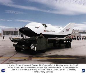 MAKE A MEME View Large Image Arrival at NASA Dryden on June 4, 1997 DVIDS730420.jpg en The actual CRV to be flown in space was expected to be 30 feet long The X-38 project is a joint effort between the Johnson Space Center Houston Texas JSC Langley Research Center ...