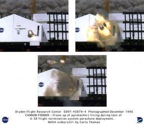 MAKE A MEME View Large Image Pyrotechnic Firing during Test of Flight Termination System Parachute Deployment DVIDS726580.jpg en In these close-ups the canister containing the seven-foot-diameter X-38 Flight Termination System FTS parachute can be seen launching safely ...