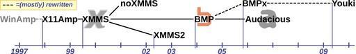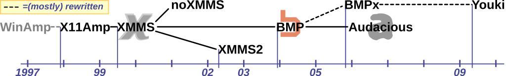 | Keywords: XMMS family tree timeline.svg XMMS family tree with timeline Stammbaum der XMMS-Abkömmlinge mit Zeitstrahl Audacious-2 4-logo svg BeepMP_logo svg XMMS_logo svg 2011-03-19 18 14 UTC Audacious-2 4-logo svg George Averill et al BeepMP_logo svg BMP project XMMS_logo svg XMMS_logo png Thomas Nilsson derivative work Pangean <span class signature-talk >talk</span> derivative work Pangean <span class signature-talk >talk</span> Original upload log This image is a derivative work of the following images File Audacious-2 4-logo svg licensed with PD-textlogo 2011-03-19T12 41 22Z Pangean 96x96 4388 Bytes <nowiki>cleanup</nowiki> 2010-11-06T05 21 58Z John lindgren 96x96 8961 Bytes <nowiki> en SVG logo of Audacious 2 4 Distributed with Audacious http //audacious-media-player org George Averill et al 2010-08-25 GPL </nowiki> File BeepMP_logo svg licensed with PD-textlogo 2011-03-17T14 42 07Z Pangean 126x126 1877 Bytes <nowiki> logo of Logo des http //sourceforge net/projects/beepmp/files/bmp/ BMP project Date </nowiki> File XMMS_logo svg licensed with PD-textlogo 2011-03-19T11 22 02Z Pangean 78x60 760 Bytes <nowiki> logo of X Multimedia System XMMS Logo des X Multimedia System 2011-03-19 11 19 UTC File X</nowiki> Uploaded with derivativeFX Audacious software Beep Media Player XMMS |