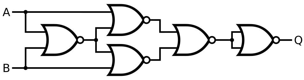 Keywords: XOR from NOR 2.svg XOR gate from only NAND gates This method has a propagation delay 4 times that of a single gate - an alternative design has just 3 and uses the same number of gates own Inductiveload 2009-01-16 Alternative logic gates XOR gates NOR gate symbols |
