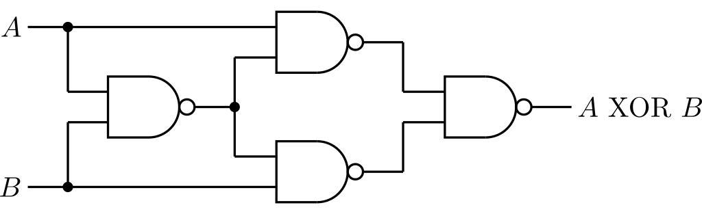| Keywords: XOR using NAND.svg XOR implemented with NAND gates XOR_Using_NAND jpg 2009-10-27 08 44 UTC XOR_Using_NAND jpg KlaudiuMihaila derivative work Robert A Maxwell <span class signature-talk >talk</span> <br /> To reproduce this image with circuit-macros use the following code <pre> PS cct_init include HOMELIB_`liblog m4' scale 25 4 Use millimetres sec 5 Horizontal length of each section vgap 20 Vertical gap between A and B nawid 11 Need a value for width of NAND gate before use LA A rjust; line right_ nawid+4 sec NA1 NAND_gate with In1 at Here move to 0 -vgap LB B rjust; line right_ nawid+4 sec NA2 NAND_gate with In2 at Here move to 2 sec -vgap/2 NA3 NAND_gate; line right_ sec; dot move to NA3 Out+ sec 0 ; line to Here x NA1 In2 y ; line to NA1 In2 move to NA3 Out+ sec 0 ; line to Here x NA2 In1 y ; line to NA2 In1 dot at LA+ sec 0 ; line to Here x NA3 In1 y ; line to NA3 In1 dot at LB+ sec 0 ; line to Here x NA3 In2 y ; line to NA3 In2 move to 2 nawid+6 sec -vgap/2 NA4 NAND_gate; line right_ sec; A XOR B ljust line from NA1 Out right_ sec; line to Here x NA4 In1 y ; line to NA4 In1 line from NA2 Out right_ sec; line to Here x NA4 In2 y ; line to NA4 In2 PE </pre> Redrawn in circuit-macros and saved as SVG circuit-macros XOR_Using_NAND jpg Alternative logic gates NAND gate symbols XOR gates |