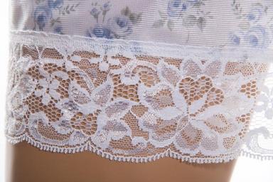 MAKE A MEME View Large Image Pretty white lace trim with sweet and delicate blue floral print on silky soft polyester fabric. So feminine. Adjustable straps too, for a more perfect fit. To be listed this coming week. Contact me for more information..... dreamdate slips ...