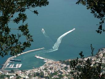 Keywords: Y sul mare.jpg it Particolare del porto di Casamicciola Terme isola d'Ischia visto dalla vetta del Monte Epomeo Le scie delle imbarcazioni che lasciano il porto sembrano disegnare una Y sul mare own Dr Conati Roberto De Martino Casamicciola Terme Monte Epomeo |