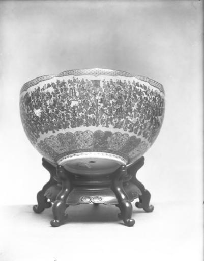 | Keywords: Yabu Meizan - Bowl with a Multitude of Women - Walters 492280.jpg This bowl was decorated by Yabu Meizan at his studio in Osaka The exterior is decorated with an intricate pattern of hundreds of women engaged in traditional arts crafts and cultural practices They are depicted in multicolored enamels that have been fired onto the bisque surface of this six-lobed foliate bowl At the base panels of flowrs ring the bowl The panels contain approximately twenty identifiable species of flowers including peonies haydrangea wisteria morning glories three types of camelias lilies etc The interior features a band of wisteria ringing the rim with blossoms hanging down into the bowl's interior Yabu Meizan's studio would purchase fired bisque stonewares from the Chinjyukan kiln in Kagoshima and from the Kinkozan kiln in Kyoto They would then transfer designs to the stoneware surfaces from pattern books held in the studio ca 1904 Meiji white stoneware with overglaze enamels and gold cm 19 accession number 49 2280 7838 Louisana Purchase Exposition St Louis 1904 Henry Walters city Baltimore Walters Art Museum Henry Walters Acquired by Henry Walters 1904 Master Potters of Japan The Walters Art Gallery Baltimore 1984 place of origin Osaka Japan PD-old-auto 1934 Meiji ceramics in the Walters Art Museum Yabu Meizan Media contributed by the Walters Art Museum needs category review Kinkozan ware |