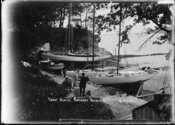 Keywords: geo:city=auckland geo:locality=tibbs beach geo:locality=tibbsbeach photographer:name=william archer price photographer:name=williamarcherprice blackandwhite monochrome black and white View of yachts up on cradles at Tibbs' Beach. Men can be seen doing maintenance on several of them. In the immediate foreground is a man in a bowler hat with a walking stick and smoking a pipe. He is talking to a man seated nearby, with a small boy by his side. Photograph taken by William A Price in the early 1900s. Inscriptions: Inscribed - Photographer's title on negative -bottom centre: Tibbs' Beach. Ponsonby. Auckland. No 2045A. William Archer Price lived and practised in Queen Street, Northcote, 1909-1910. Source: New Zealand Post Office directories Quantity: 1 b&w original negative(s). Physical Description: Dry plate glass negative 4.5 x 6.5 inches Yachts at Tibbs' Beach, Ponsonby, Auckland. Price, William Archer, 1866-1948 :Collection of post card negatives. Ref: 1/2-000672-G. Alexander Turnbull Library, Wellington, New Zealand. natlib.govt.nz/records/22797167 View of yachts up on cradles at Tibbs' Beach. Men can be seen doing maintenance on several of them. In the immediate foreground is a man in a bowler hat with a walking stick and smoking a pipe. He is talking to a man seated nearby, with a small boy by his side. Photograph taken by William A Price in the early 1900s. Inscriptions: Inscribed - Photographer's title on negative -bottom centre: Tibbs' Beach. Ponsonby. Auckland. No 2045A. William Archer Price lived and practised in Queen Street, Northcote, 1909-1910. Source: New Zealand Post Office directories Quantity: 1 b&w original negative(s). Physical Description: Dry plate glass negative 4.5 x 6.5 inches Yachts at Tibbs' Beach, Ponsonby, Auckland. Price, William Archer, 1866-1948 :Collection of post card negatives. Ref: 1/2-000672-G. Alexander Turnbull Library, Wellington, New Zealand. natlib.govt.nz/records/22797167