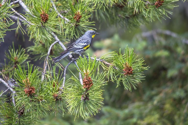 Keywords: yellow-rumped warbler bird wildlife nature tree perched portrait branch pine