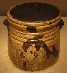 Keywords: Yellow Seto ware water jar, 17th century, Metropolitan Museum of Art, 17.118.81a,b.JPG Water jar Momoyama or Edo period 17th century clay covered with glaze and iron-brown splashes and black lacquer cover yellow Seto ware Metropolitan Museum of Art accession 17 118 81a b own photo 2013 Wmpearl Cc-zero Mizusashi Art of Japan in the Metropolitan Museum of Art Seto ware |