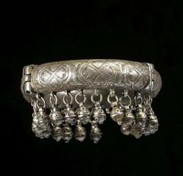 Keywords: Yemeni - Bracelet - Walters 572318 - View A.jpg The chased bracelet is made of a larger 2/3 and a smaller piece 1/3 that together form a hollow ring which is held together by a clasp The design depicts fourleaf clovers six on the larger piece and three on the smaller piece of the ring The lower rim has twenty-two loops each with a ring - twenty with three-dimensional drop-shaped pendants one with a two dimensional drop-shaped pendant and one with a rosette-shaped pendant The inside of the bracelet has an Arabic stamp with the name of the ruler al-Mahdi The similarity to stamps of al-Mahdi al- Abbas makes it likely that the pendants were produced under his reign from AH 1161-1189 AD 1748-1775 In addition the name of the silversmith is engraved in Hebrew xxx Iraqi The first name is lost but the supplement Iraqi clarifies that he or his family came from originally from Iraq 1161-1189 AH/AD 1748-1775 silver with gilding Outer diam cm 7 ; Inner diam 1 7/8 x W 13/16 in 4 8 x 2 1 cm accession number 57 2318 80922 Mr Benjamin Zucker Zucker Family Trust and Mr Derek Content New York and London by purchase Walters Art Museum Joint gift to the Walters Art Museum Baltimore and the Israel Museum Jerusalem by Mr Benjamin Zucker and Mr Derek Content in honor of Mrs Barbara Zucker and Mrs Amanda Content 2010 Stamp Arabic al-Mahdi Engraving Hebrew xxx 'Iraqi place of origin northern Yemen Walters Art Museum license Jewellery in the Walters Art Museum South Arabian art in the Walters Art Museum Art of Yemen Media contributed by the Walters Art Museum needs category review |