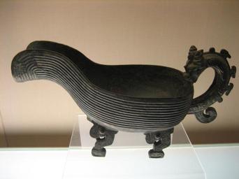 Keywords: Yi of Marquis Qi.jpg Yi of Marquis Qi <br>A Yi is an ancient ritual bronze vessel from China It is believed that it was used to hold water for washing the hands before rituals like sacrifices This Yi has the shape of half a gourd with a handle in the shape of a dragon and an oval base It is supported by four legs decorated with taotie animal mask designs The bottom shows 22 chinese characters written in 4 lines stating that the Marquis of Qi cast this Yi for his wife Mengji Liangnii the princess of the State of Guo It is from the late Western Zhou Dynasty -1046 to -771 and is part of the collections of the Shanghai Museum Height 24 7cm Length 48 1cm Weight 6 42 kg Yi du Marquis Qi <br>Un Yi est un type ancien de vase chinois en bronze Il est possible que les Yi servaient au lavage des mains avant les rituels tels que les sacrifices Ce Yi ressemble à une demie-gourde munie d'une anse en forme de dragon et sa base ovale est supportée par quatre pieds décorés de motif taotie masques zoomorphes Le dessous montre 22 caractères chinois rédigés sur 4 lignes déclarant que « le marquis de Qi a forgé ce Yi pour sa femme Mengji Liangnii princesse de l'état de Guo » Il date de la période tardive de la dynastie des Zhou occidentaux -1046 à -771 et fait partit de la collection du Musée de Shanghai Hauteur 24 7cm Longueur 48 1cm Poids 6 42 kg pl Wystawa Starożytnych Chińskich Brązów w Muzeum Szanghajskim zh-cn 齐 own Mountain 2006-04-08 <gallery> File 20090822 Shanghai Museum 3256 jpg File Western Zhou water vessel of Marquis Qi SM JPG File Yi of Marquis Qi jpg </gallery> Yi of Marquis of Qi |