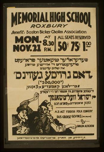 Keywords: Yiddish theater poster roxbury.jpg en Poster for Federal Theatre Project presentation of Dus Groise Gevins at Memorial High School Roxbury Mass showing three men sewing Work Projects Administration Poster Collection Library of Congress http //memory loc gov/service/pnp/cph/3f00000/3f05000/3f05400/3f05474r jpg Federal Art Project 1938 PD-USGov-WPA Yiddish theatre Federal Theatre Project posters PD-USGov |