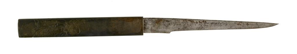Keywords: Yokoya Somin V - Kozuka with Hotei and Child - Walters 5111693.jpg Hotei is one of the seven gods of good fortune shichifukujin He is often depicted as a rotund Buddhist monk with a bag of treasures When depicted without the other gods he is frequently depicted with small children Here the image of Hotei is incised on the kozuka body and wraps around to the reverse The small child is at Hotei's left This is part of a mounted set 1795-ca 1855 Edo shibuichi gold cm 20 4 accession number 51 1169 3 21491 William T / Henry Walters Collection Baltimore date and mode of acquisition unknown Walters Art Museum Henry Walters Acquired by William T or Henry Walters Signature Yokoya Sômin kao place of origin Edo present-day Tokyo Japan Walters Art Museum license Tosogu Japanese sword fittings in the Walters Art Museum Yokoya Somin V Media contributed by the Walters Art Museum needs category review |