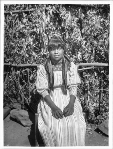 Photograph of a Yokut Indian girl of school age (ca. early teens?), Tule River Reservation near Porterville, California, ca.1900. She is sitting on a wooden chair outside. Her hands lay on her lap. She is wearing a long striped dress with puffy sleeves. A silk(?) scarf is tied about her long dark hair in back (not visible) and drapes over her shoulders to her chest. She is looking slightly to her left. Foliage is visible behind her.