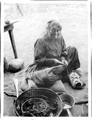 Photograph of a Yokut Indian woman basket maker, Tule River Reservation near Porterville, California, ca.1900. She sits in a half-crouch on a half-filled sack on the ground outside. Basket making supplies sit in a large round basket in front of her. A dead small furry rodent (a marmot?) lays on the ground at her left from which she appears to be drawing the viscera or intestine for use in basket making. Part of a wooden table is visible behind her.