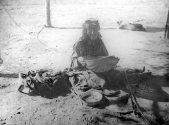 Photograph of a Yokut Indian woman sifting corn meal in a reed basket, Tule River Reservation near Porterville, California, ca.1900. She is kneeling on a blanket outside holding the sifting basket about chest high. Basket making materials sit next to her. A pan sits in front of her. She is turned slightly to her left. A dog is laying in the shade of a wooden post behind her.
