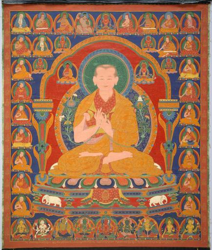 | Keywords: Yong Zin Khon Shogpel, Seventh Abbot of Ngor Monastary.jpg Yong Zin Khon Shogpel Seventh Abbot of Ngor Monastary Tibet Distemper and gold on cloth Image 31 x 26 1/4 in 78 7 x 66 7 cm Mount 49 1/2 x 28 in 125 7 x 71 1 cm This painting is one of two in the collection from a set depicting the abbots of Ngor monastery Tibetan Buddhism assigns extraordinary prestige and reverence to abbots who are believed to embody the teachings of their lineage and therefore seen to be living embodiments of enlightenment Ngor monastery followed the teachings of the Sakya school and is associated with an important set of mandalas painted by a group of itinerant Nepalese artists shortly after it was founded in 1429 This tangka is painted in a style still predominantly influenced by Nepal but showing a new awareness of Chinese art in such details as the throne base and the naturalistic treatment of drapery Lotuses supporting holy books flank the preaching hierarchy The upper registers contain the Sakya order lineage and the lower show a group of protective and auspicious deities http //www metmuseum org/collection/the-collection-online/search/37816 http //images metmuseum org/CRDImages/as/original/DT5219 jpg direct link century 16 author PD-old-100 Mandala thangka from Tibet Tibetan Buddhist paintings in the Metropolitan Museum of Art 16th-century paintings from Tibet Files uploaded by Yann Forget Sakya |