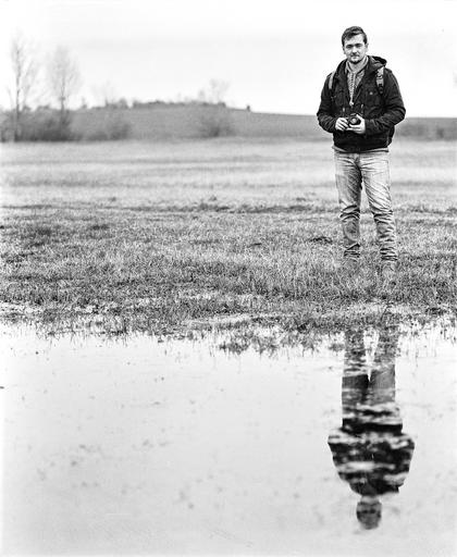 Keywords: young man photographer camera young male handsome journey travel reflection outdoors smiling water