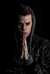 Keywords: young man portrait darkness handsome young man expression male person people young man white handsome caucasian casual attractive face confident praying mantra namaste duality dual light tattoo hoodie