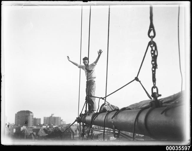 Keywords: hood collection hoodcollection samuel j hood studio collection samueljhoodstudiocollection magdalene vinnen magdalenevinnen sydney woolloomooloo barque german german barque germanbarque sydney harbour sydneyharbour ted hood tedhood sam hood samhood blackandwhite monochrome photo border black and white This photograph possibly depicts Samuel J Hood's son Ted Hood on board MAGDALENE VINNEN. The vessel sailed into Sydney Harbour on 27 February 1933, under the command of Captain Lorenz Peters. The barque was loaded with almost 16,000 bales of wool, the fourth largest shipment to have left Sydney, before it sailed the record-breaking 82-day voyage for Falmouth, England. MAGDALENE VINNEN visited Australia again in 1935, with a cargo of wheat, lifted from Port Broughton in South Australia. This photo is part of the Australian National Maritime Museum’s Samuel J. Hood Studio collection. Sam Hood (1872-1953) was a Sydney photographer with a passion for ships. His 60-year career spanned the romantic age of sail and two world wars. The photos in the collection were taken mainly in Sydney and Newcastle during the first half of the 20th century. The ANMM undertakes research and accepts public comments that enhance the information we hold about images in our collection. This record has been updated accordingly. Photographer: Samuel J. Hood Studio Collection Object no. 00035597 This photograph possibly depicts Samuel J Hood's son Ted Hood on board MAGDALENE VINNEN. The vessel sailed into Sydney Harbour on 27 February 1933, under the command of Captain Lorenz Peters. The barque was loaded with almost 16,000 bales of wool, the fourth largest shipment to have left Sydney, before it sailed the record-breaking 82-day voyage for Falmouth, England. MAGDALENE VINNEN visited Australia again in 1935, with a cargo of wheat, lifted from Port Broughton in South Australia. This photo is part of the Australian National Maritime Museum’s Samuel J. Hood Studio collection. Sam Hood (1872-1953) was a Sydney photographer with a passion for ships. His 60-year career spanned the romantic age of sail and two world wars. The photos in the collection were taken mainly in Sydney and Newcastle during the first half of the 20th century. The ANMM undertakes research and accepts public comments that enhance the information we hold about images in our collection. This record has been updated accordingly. Photographer: Samuel J. Hood Studio Collection Object no. 00035597 |