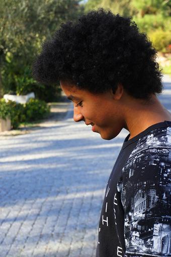 Keywords: young men face profile male portrait smile afro haircut cap glasses hipster