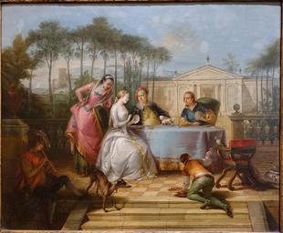Keywords: Young Noble Couple Playing Cards on a Terrace with Attendants, by Francesco Zugno, c. 1750-1755, oil on canvas - Blanton Museum of Art - Austin, Texas - DSC08037.jpg en Exhibit in the Blanton Museum of Art - Austin Texas USA This work is old enough so that it is in the public domain 2015-11-15 16 23 37 own Daderot other versions PD-old-100 cc-zero Italian paintings in the Blanton Museum of Art Francesco Zugno People playing card games in art |