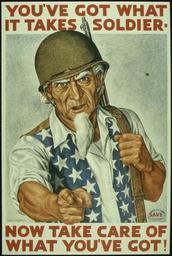 Keywords: "YOU'VE GOT WHAT IT TAKES SOLDIER. NOW TAKE CARE OF WHAT YOU'VE GOT." - NARA - 516293.jpg Scope and content General notes 516293 Local identifier 44-PA-2566 Office for Emergency Management Office of War Information Domestic Operations Branch Bureau of Special Services 03/09/1943 - 09/15/1945 Still Picture Records Section Special Media Archives Services Division NWCS-S National Archives at College Park 8601 Adelphi Road College Park MD 20740-6001 1941 - 1945 Record group Record Group 44 Records of the Office of Government Reports 1932 - 1947 Record group ARC 373 World War II Posters compiled 1942 - 1945 Series ARC 513498 File unit File unit ARC Variant control numbers NAIL Control Number NWDNS-44-PA-2566 Other versions <gallery> File YOU'VE_GOT_WHAT_IT_TAKES_SOLDIER _NOW_TAKE_CARE_OF_WHAT_YOU'VE_GOT _-_NARA_-_516293 tif tif File YOU'VE_GOT_WHAT_IT_TAKES_SOLDIER _NOW_TAKE_CARE_OF_WHAT_YOU'VE_GOT _-_NARA_-_516293 jpg jpg </gallery> NARA-cooperation PD-USGov World War II posters from the United States Uncle Sam in propaganda |