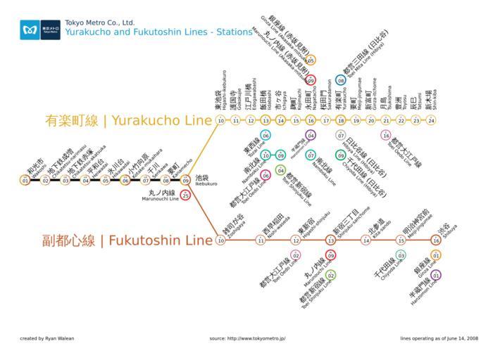 Keywords: Yurakucho-fukutoshin.svg Tokyo Metro Yurakucho and Fukutoshin Lines own 2008-09-18 Ryan Walean Bigtop Public domain Tokyo Metro Yūrakuchō Line Tokyo Metro Fukutoshin Line