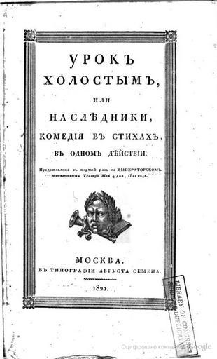 | Keywords: Zagoskin urok holostym.jpeg ru Обложка пьесы в стихах Загоскина У ок холостым или наследники http //books google com/books id TtQ_AAAAIAAJ printsec titlepage dq Zagoskin lr as_brr 1 hl ru output html source gbs_summary_s cad 0 M N Zagoskin 1822 PD-Old PD-old Mikhail Zagoskin 1822 books Books covers from Russia |