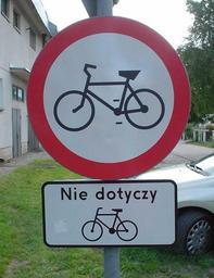 Keywords: ZakazRowerowNiedotyczacyRowerow.jpg Polish traffic signs in Darlowo; seeming paradox “ Cycling <u>and moped</u> prohibited sign and under it Except bikes own 2006-06-28 jarsson DarÅ‚owo Bicycles forbidden road signs Paradoxes Additional road signs in Poland Road signs in Poland |