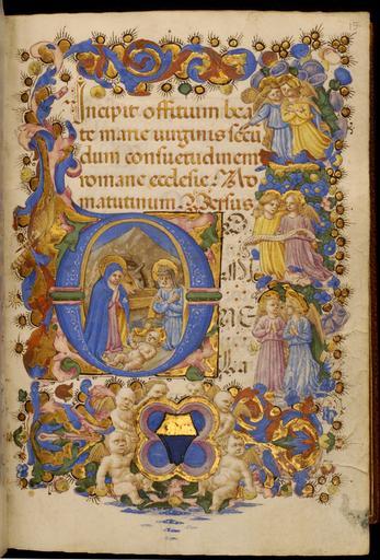 | Keywords: Zanobi di Benedetto Strozzi - Leaf from Adimari Book of Hours - Walters W76715R - Open Obverse.jpg ink paint gold parchment cm 13 4 9 4 accession number W 767 15R 28250 The Adimari family Florence ca 1448 family coat of arms on fol 15r Reverend Walter Sneyd prior to December 16 1903 mode of acquisition unknown Sale Sotheby's London December 16 1903 lot 555 note on rear paste-down Charles Fairfax Murray December 16 1903 by purchase C W Dyson Perrins 1906 Sale Sotheby's London December 1 1959 lot 80 Walters Art Museum Baltimore December 1 1959 by purchase Museum purchase 1959 The Nativity in Medieval and Renaissance Manuscripts The Walters Art Gallery Baltimore 1987-1988 place of origin Florence Italy Walters Art Museum license 2D Walters MS W767 - Adimari Book of Hours Miniatures of the nativity of Jesus Christ |
