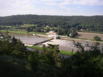 Keywords: Zdymadlo Dolany CZ 088.jpg Zdymadlo Dolany na řece Vltavě okres Mělník Celkový pohled od severovýchodu ze svahu přírodní památky Hlaváčková stráň Dobře patrný je jez s objektem MVE při protějším břehu v popředí protáhlým ostrovem oddělená plavební komora V dálce za polem probíhá železniční trať Praha - Kralupy nad Vltavou Dolany Sluice on the Vltava River Mělník District Czech Republic 50 12 47 N 14 21 27 E type landmark_region CZ ±15 m Dolany Sluice |