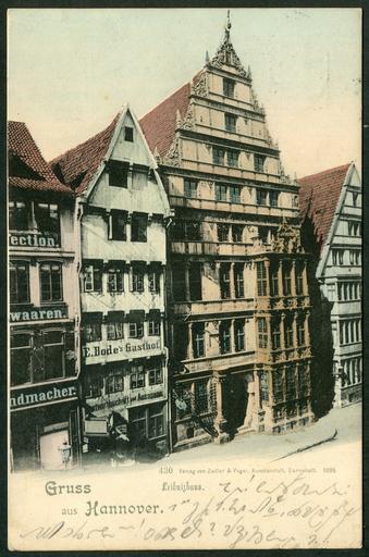 Keywords: Zedler & Vogel PC 00430 1899 Gruss aus Hannover. Leibnizhaus. Bildseite koloriert, historische Gebäude Schmiedestraße Ecke Corvinusweg.jpg Im Lichtdruck-Verfahren reproduzierte und nachträglich kolorierte Aufnahme um 1899 der Firma Zedler Vogel als fortlaufen nummerierte Ansichtskarte Nummer 430 mit dem historischen Leibnizhaus in Hannover in der Schmiedestraße Ecke Corvinusweg Dieses Dokument wurde freundlicherweise von Heralde Schmitt-Ulms zum Scannen geliehen um es als Digitalisat über Commons nachhaltig allen Menschen zu Bildungszwecken zur Verfügung zu stellen Scan vom Original Bernd Schwabe in Hannover 1899 anonymer Fotograf; Druck Zedler Vogel PD-old Documents by Heralde Schmitt-Ulms Zedler Vogel Altes Leibnizhaus Hannover |