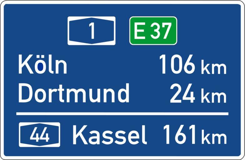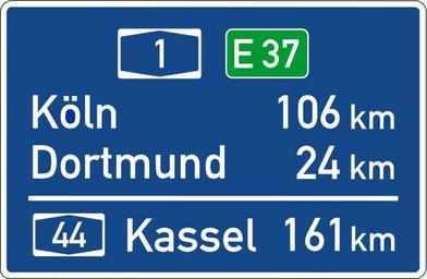 Keywords: Zeichen 453.svg Zeichen 453 “ Entfernungstafel Sign No 453 “ destinations and distances Image taken from the de Straßenverkehrsordnung German Road Regulations as published by the de Bundesministerium für Verkehr Bau- und Wohnungswesen German Federal Ministry of Traffic Building and Housing at http //www bmvbw de/Verkehr/Strasse- 1449/Strassenverkehrs-Ordnung htm own Andreas06 01 August 2006 Hochladedatum <gallery> File Zeichen 453 - Autobahn - Entfernungstafel StVO 1970 svg </gallery> PD-GermanGov Cc-zero PD-VzKat Bundesautobahn 1 Entfernungstafel Bundesautobahn 44 Entfernungstafel E37 Diagrams of direction road signs of Germany 453 svg Diagrams of direction road signs of Germany 1992 set 453 svg Diagrams of motorway road signs of Germany Entfernungstafel |