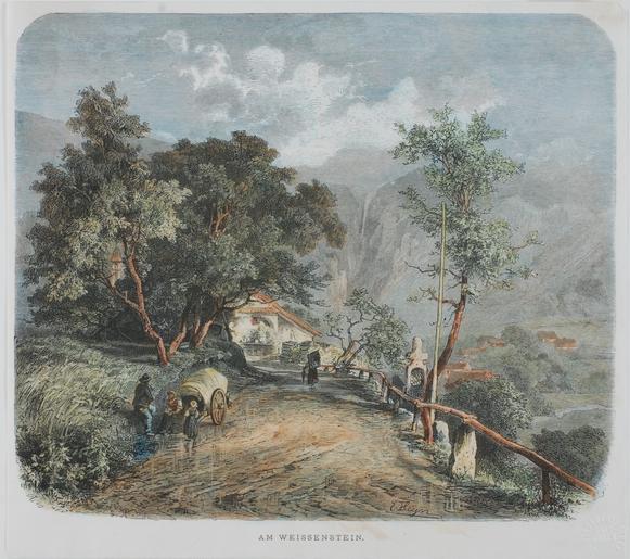 Keywords: Zentralbibliothek Solothurn - AM WEISSENSTEIN - a0595.tif Artwork Creator Ernst Friedrich Heyn langswitch Strasse die auf Oberndorf zuführt von dem hinter Bäumen ein Haus und der Kirchturm zu sehen sind etwas weiter weg weitere Häuser Auf der Strasse rastende Leute bei einem Wagen und eine Lasten tragende Frau Route qui mène vers Oberndorf nous voyons des arbres derrière une maison et le clocher de l'église un peu plus loin sont d'autres habitations Sur la route des personnes se reposent dans une voiture et une femme avec une charge Road to Oberndorf we see trees behind a house and a church tower a little further are other houses On the way people sit in a car and a woman with a load rest on the road 1890 Technique Wood engraving paper colored Size mm 187 159 institution Zentralbibliothek Solothurn object history credit line accession number Call number a0595 Zentralbibliothek Solothurn Public domain Information field ZBS form heading Strassenszene Information field ZBS form heading Landschaftsbild Zentralbibliothek Solothurn PD-old-70-1923 Historical images of Weissenstein Ernst Friedrich Heyn |