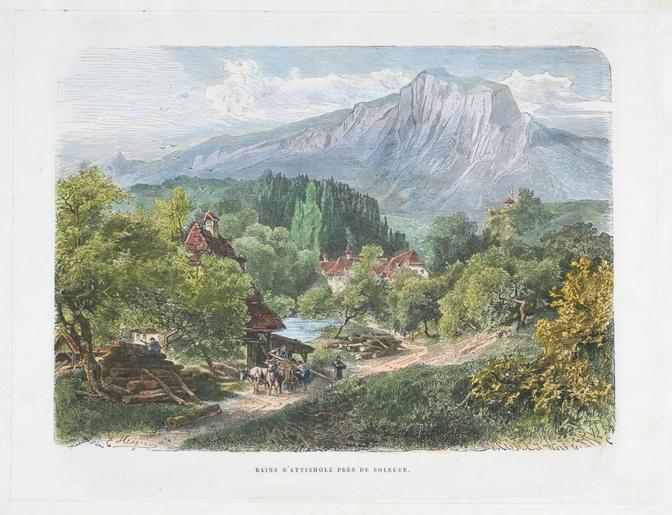 Keywords: Zentralbibliothek Solothurn - BAINS DATTISHOLZBAD PRÈS DE SOLEURE - aa0580.tif Artwork Creator Ernst Friedrich Heyn Blick von SE auf die hinter Bäumen gelegenen Gebäude des Bades Attisholz Im Vordergrund ein Sägewerk und Männer bei der Arbeit im Mittelgrund ein Weiher between 1850 1870 Technique Wood engraving paper colored Size mm 190 160 institution Zentralbibliothek Solothurn object history credit line accession number Call number aa0580 Zentralbibliothek Solothurn Public domain Information field ZBS form heading Vedute Information field ZBS form heading Landschaftsbild Zentralbibliothek Solothurn PD-old-70-1923 Historical images of the canton of Solothurn Ernst Friedrich Heyn Attisholz |